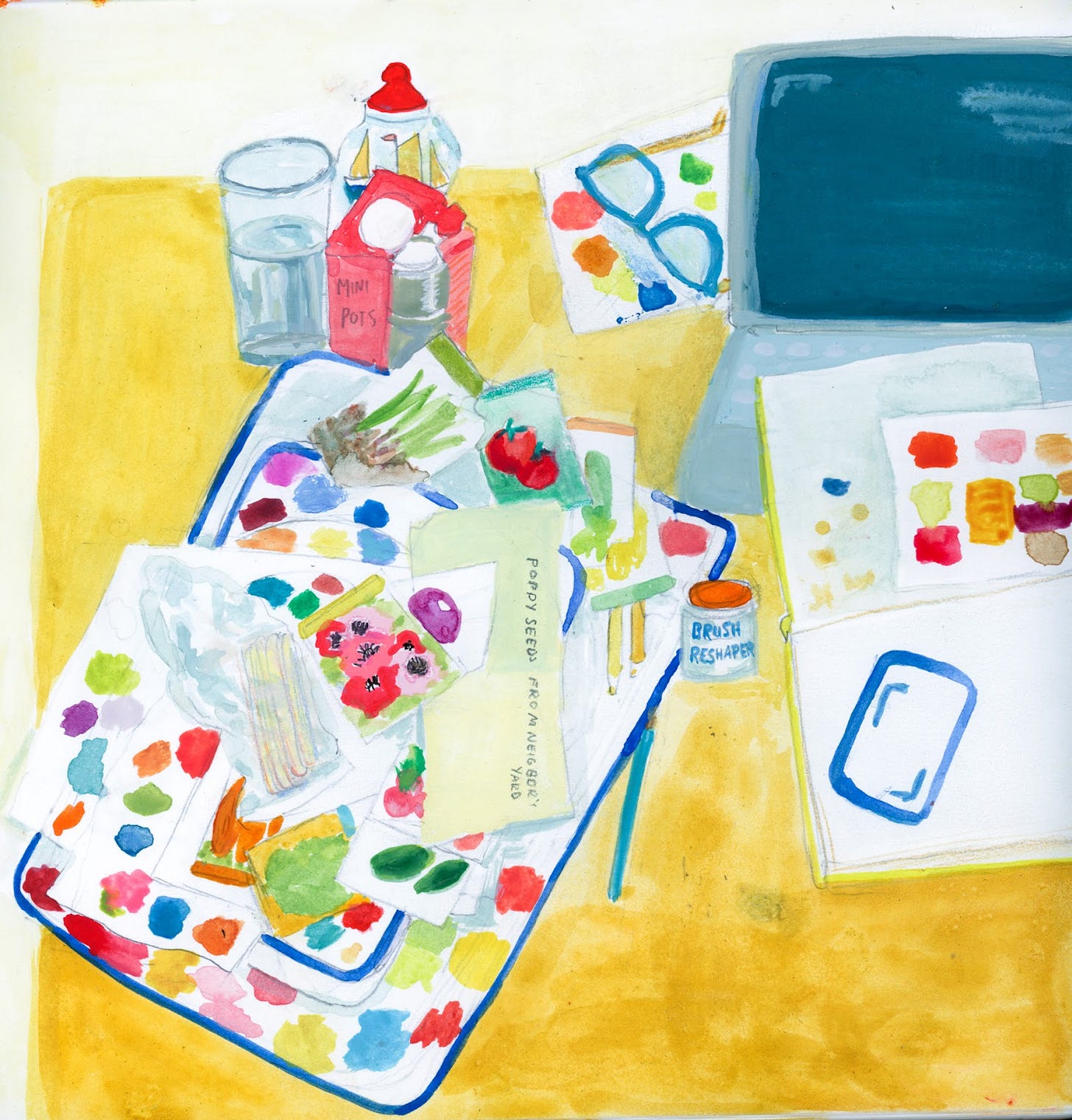 Today I’m showing up here with you without having done any of my mundane to-dos (gold star for that!). My art table is still in a very similar state as in the still life above, although it has shifted and evolved as messy art spaces tend to do. I’m not sure if I agree with my classmate that a messy art table means I’m not holding my art or creativity in regard. Some of the most creative among us are “messies”. I think my art space shows that life’s messy, I definitely don’t have it all together, and that I’m creating anyways.