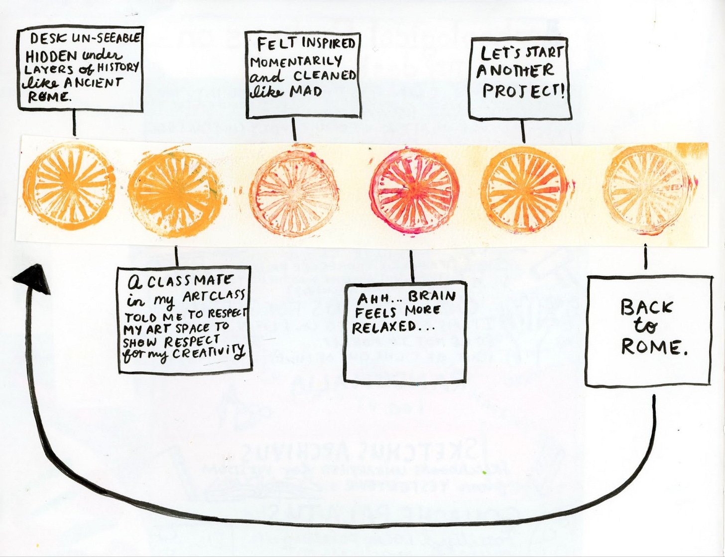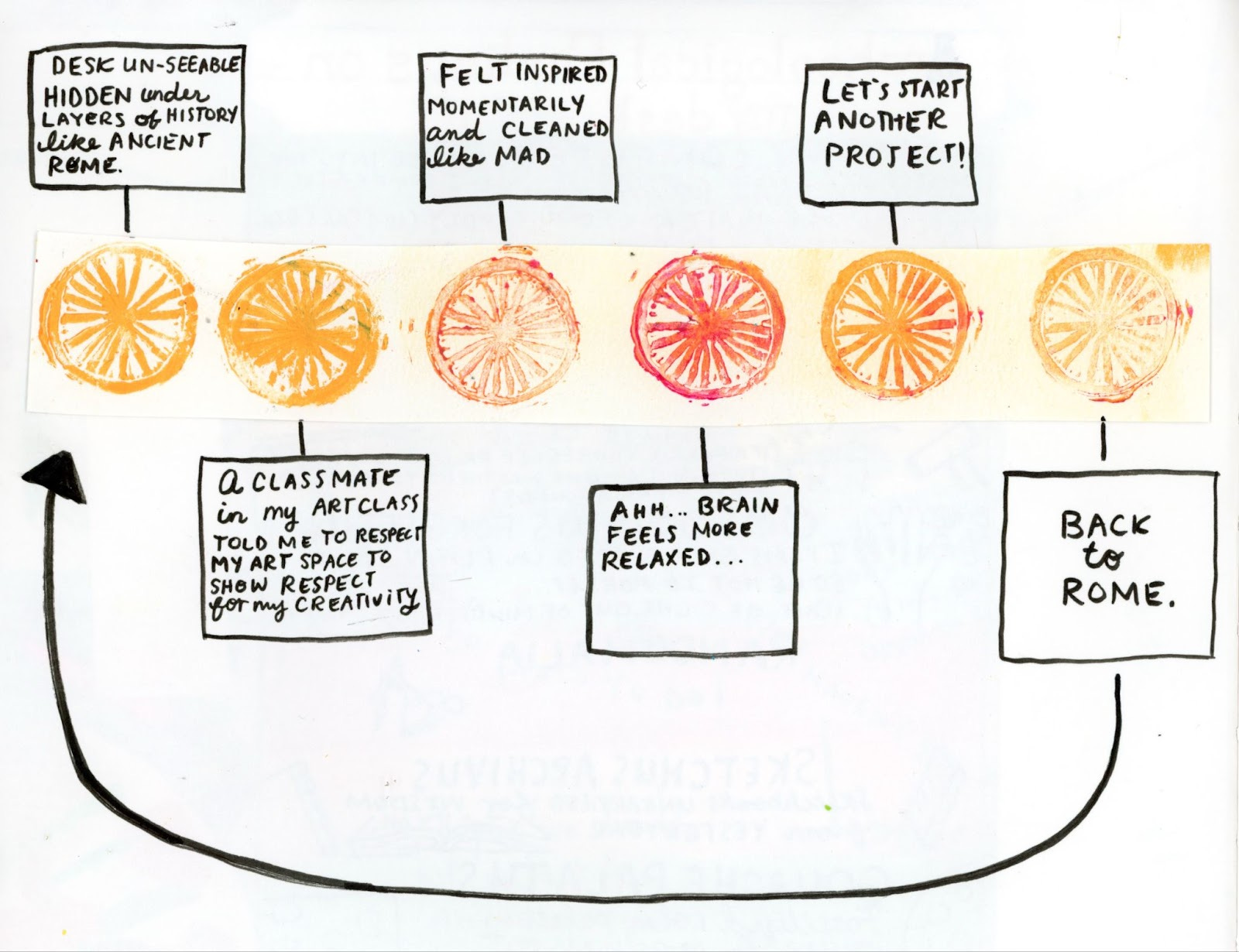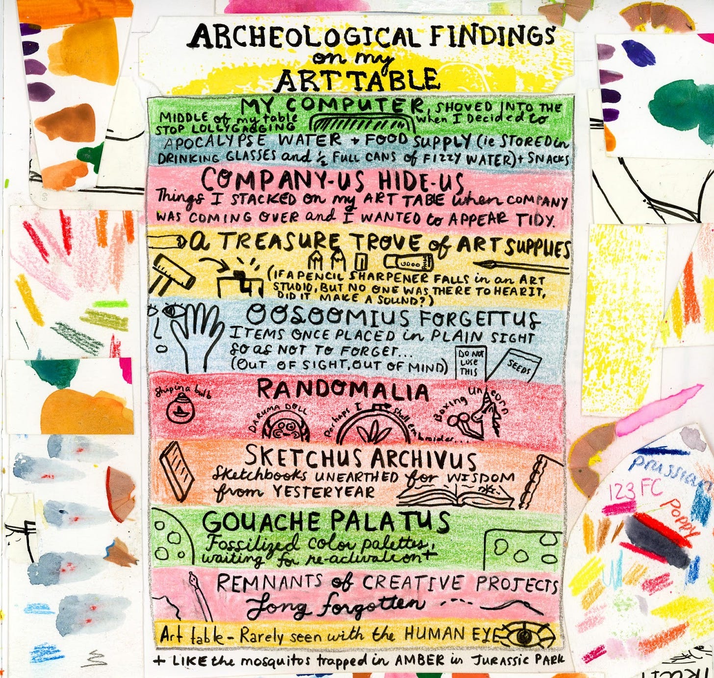 And here’s an archeological diagram of the strata of my art table. Put on your hard hats people!